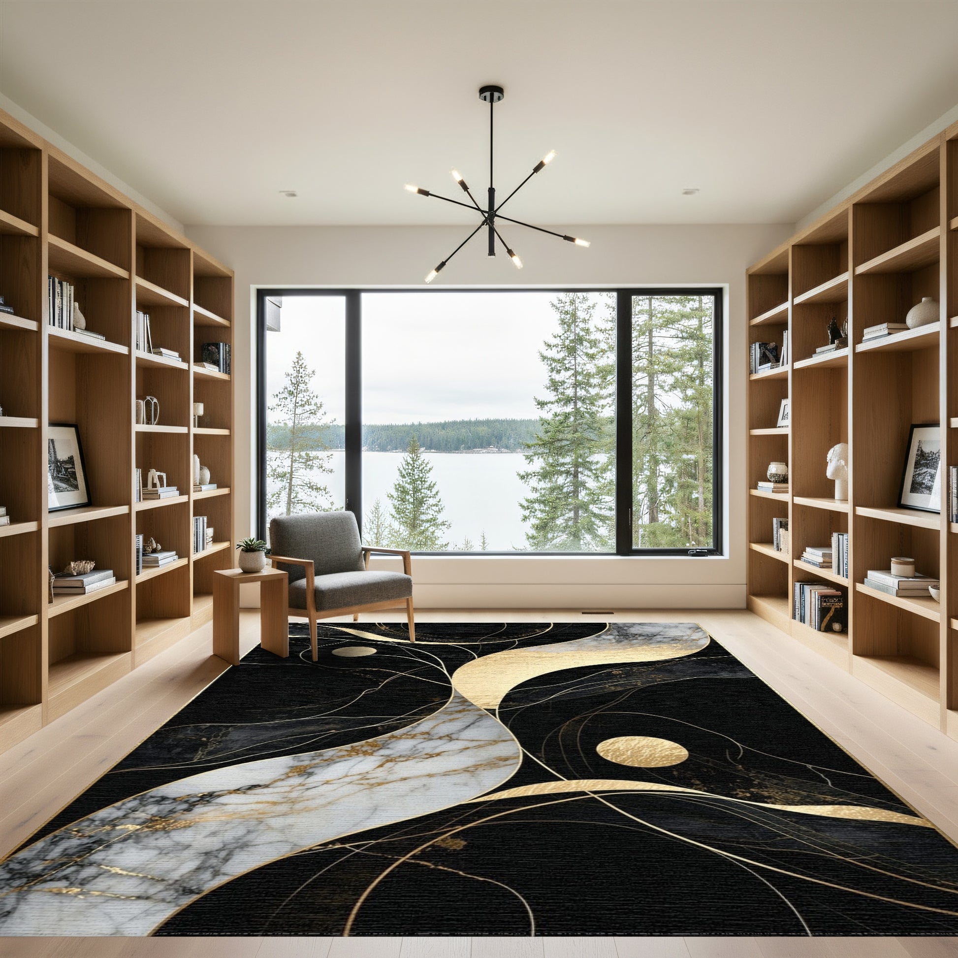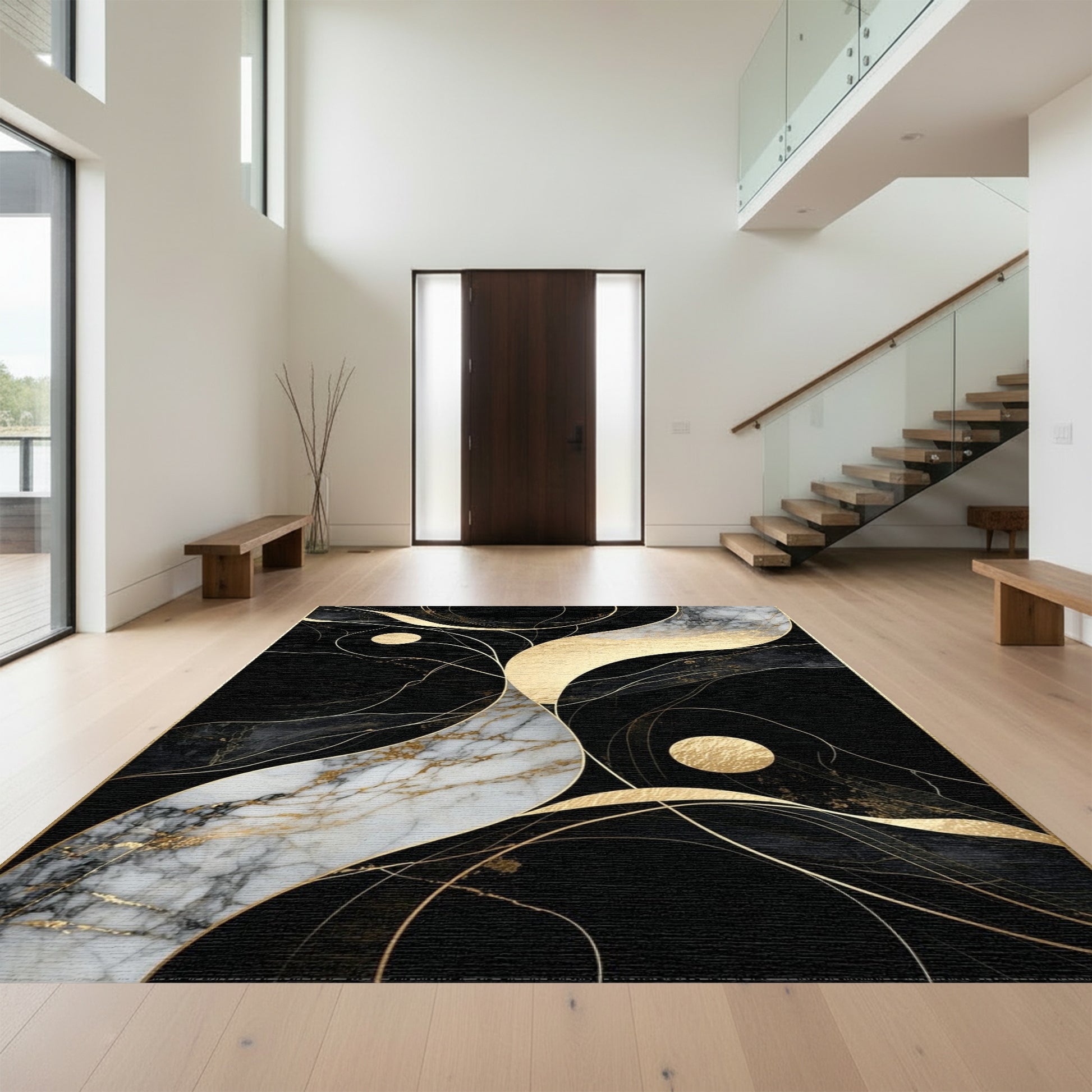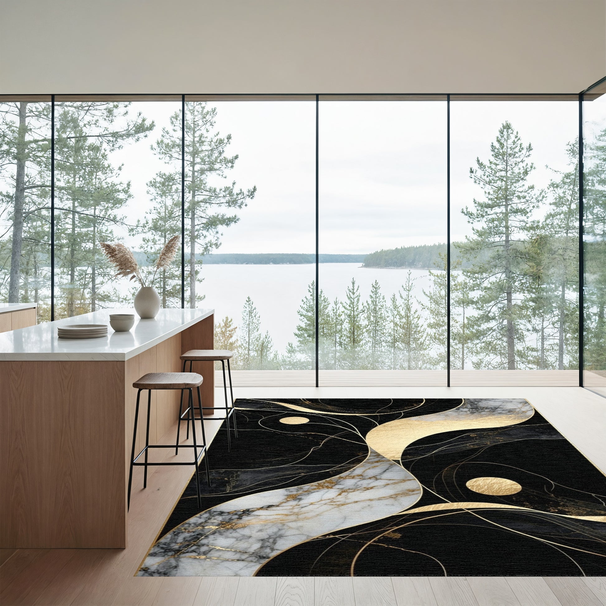 Flatwoven High Traffic Area Rug, Abstract Black Gold Marble Swirl Rug, Non Slip, Stain Resistant, Washable Area Rugs for Living Room, Bedroom Overview: