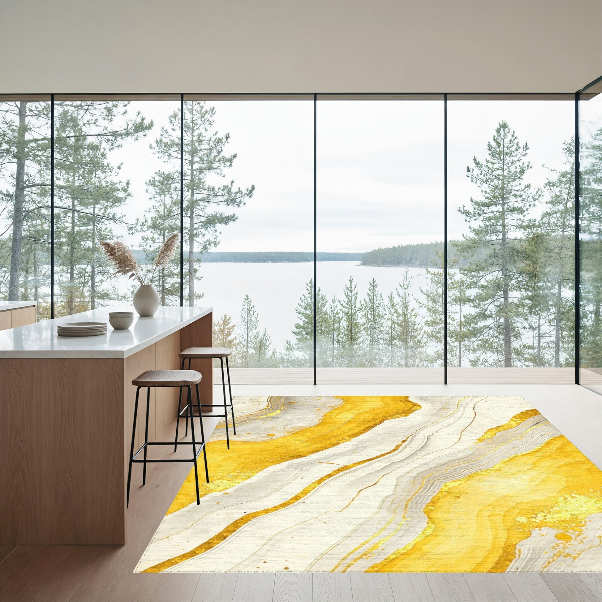 Flatwoven High Traffic Area Rug, Gold Veined Marble Abstract Rug, Non Slip, Stain Resistant, Washable Area Rugs for Living Room, Bedroom Overview: