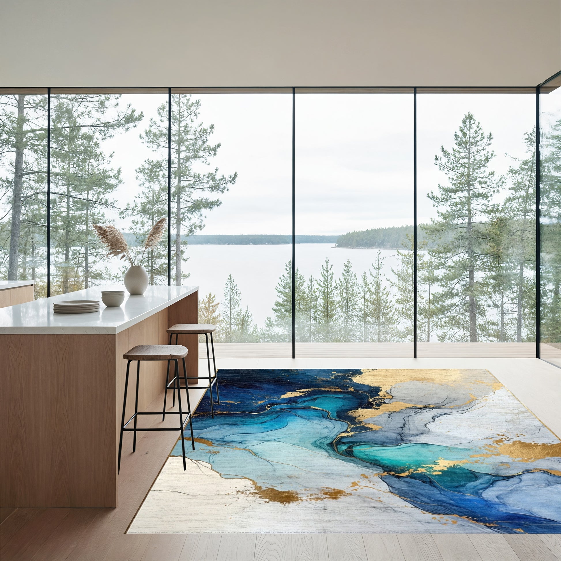 Flatwoven High Traffic Area Rug, Navy Teal Gold Fluid Swirl Rug, Non Slip, Stain Resistant, Washable Area Rugs for Living Room, Bedroom Overview: