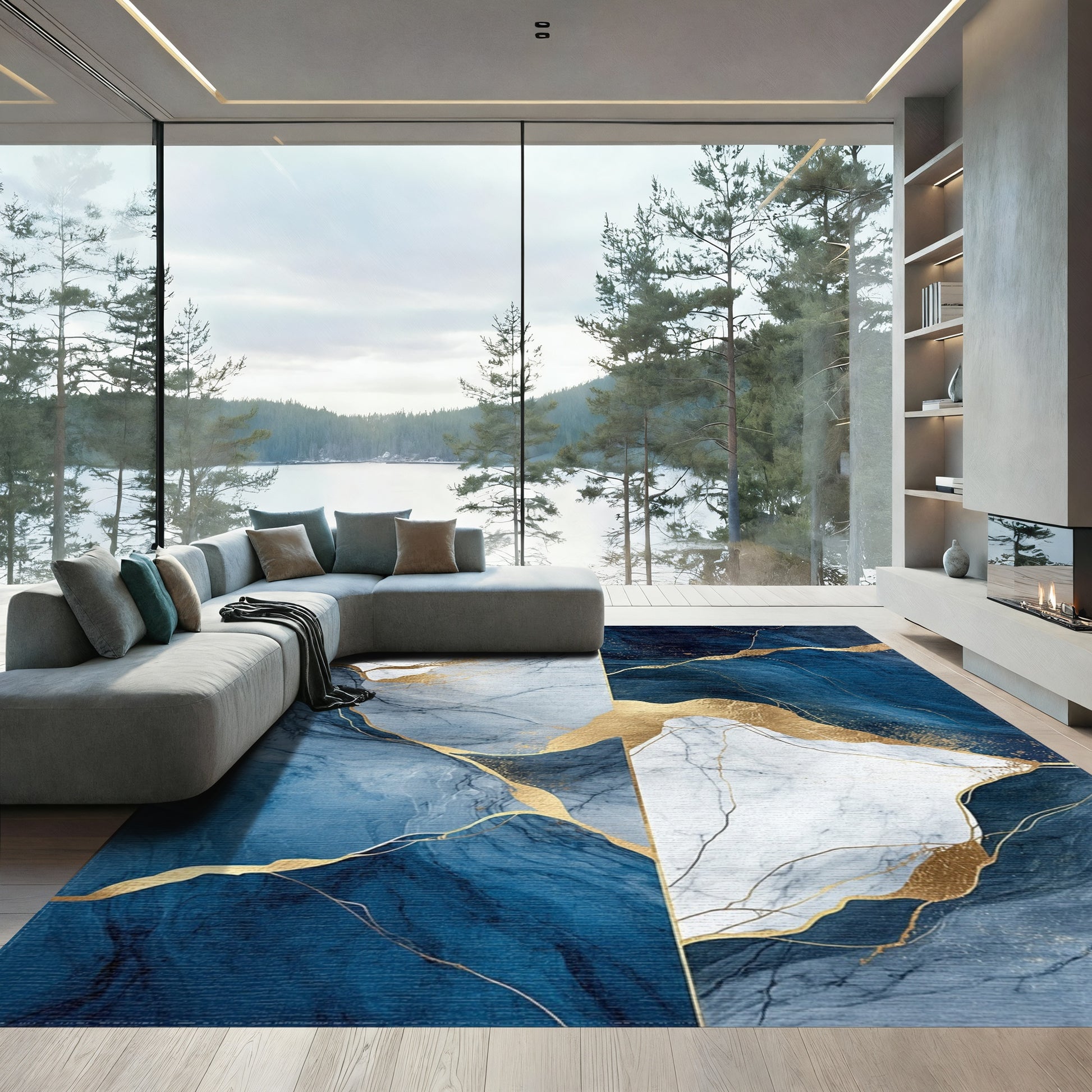 Navy White Gold Veined Marble Rug