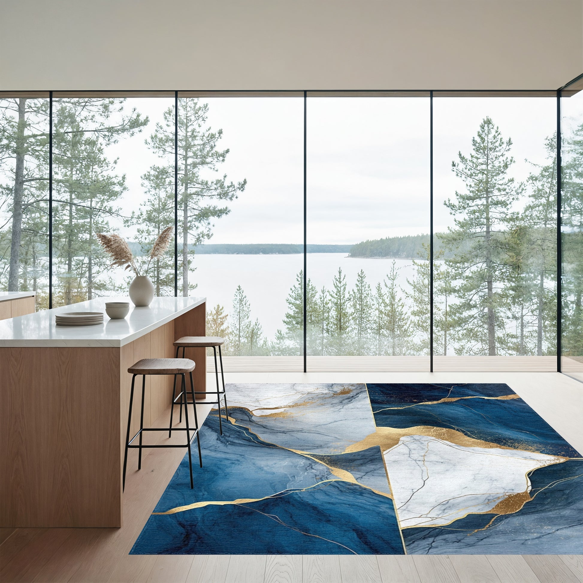 Flatwoven High Traffic Area Rug, Navy White Gold Veined Marble Rug, Non Slip, Stain Resistant, Washable Area Rugs for Living Room, Bedroom Overview: